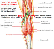 If you rub QR cream in firmly by pressing hard on the nerves that cause the cramps in your calf or on the side of your leg, you can usually get rid of the cramp very quickly.ย Here is where you should rub